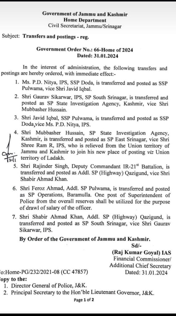 An order copy which lies with the News CNI reads that the govt of j&k has ordered the transfer and posting of seven police officers in which P.D. Nitya, IPS, SSP Doda, has been transferred and posted as SSP Pulwama, vice Shri Javid Iqbal.